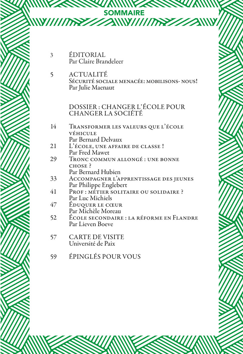 À l’heure où se prépare la mise en place du « Pacte pour un enseignement d’excellence », nous vous proposons un dossier sur l’école. Celui-ci n’est pas consacré dans son ensemble au Pacte, mais saisit plutôt l’occasion de son actualité pour offrir une réflexion plus large sur l’école et l’enseignement.