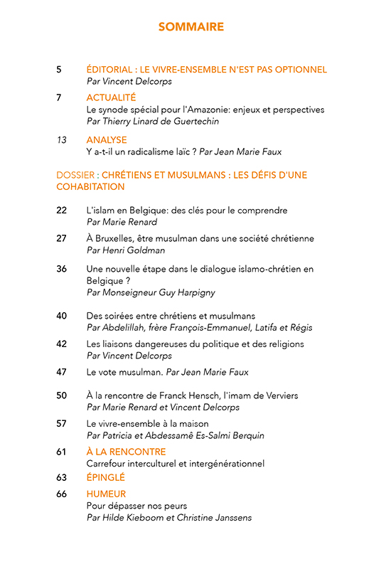 À coups d’amalgames, on insiste sur ce qui les distingue. On les présente parfois comme des adversaires. Les uns seraient chez eux, ici depuis toujours ; les autres apparaitraient comme des conquérants, menaçant la paix sociale et les valeurs du lieu. Ils ne partageraient ni la même foi, ni la même façon de (la) vivre. Et si nous allions au-delà des préjugés ? Et si nous nous plongions sur le vrai terrain du quotidien ? Chaque jour, en effet, chrétiens et musulmans vivent ensemble. À la maison, à l’école, au travail, loin des préjugés, ils mettent la main dans la même pâte – bien qu’ils ne soient pas nécessairement confrontés aux mêmes défis. Sans nier les questions qui fâchent, ce numéro d’En Question entend apporter une vision nouvelle et revigorante de la manière dont chrétiens et musulmans se côtoient et s’engagent au service de la société. Habités, bien souvent, des mêmes idéaux.