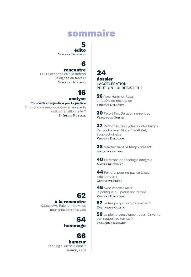 Ah ! le temps, ce bien si précieux… Et si fuyant ! Qui donc pourrait prétendre ne pas être touché.e par le phénomène de l’accélération ? Toutes les sphères de l’existence sont concernées : nos vies personnelles – comme citoyen, travailleur, parent, consommateur… – mais aussi la vie en société – dans ses sphères économique, politique, médiatique… Comment expliquer que, censés « gagner » du temps grâce à la technologie, nous avons si souvent l’impression de courir après lui ? Dans ce numéro, nous nous penchons sur ce phénomène : d’où vient-il ? Quels sont ses effets ? Est-il possible (et souhaitable) d’en sortir ? Quels sont les espaces de résistance possibles ? Vous ne trouverez pas ici de réponse toute faite. Mais de nombreuses pistes pour mieux comprendre – et interroger – votre propre rapport au temps.