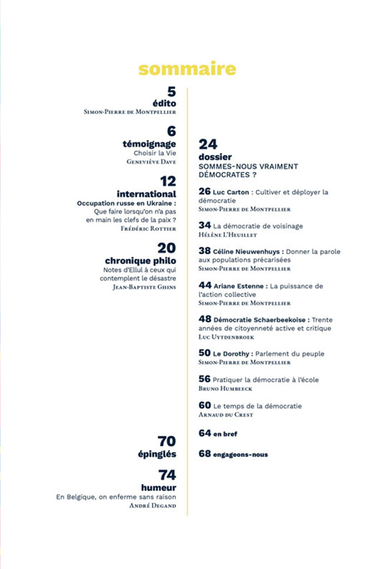 Dans quel état se trouve la démocratie ? Pourquoi est-ce si important et urgent de l’approfondir, de la cultiver et de la déployer ? Et comment s’y prendre ? Pour entamer ce dossier, Luc Carton explore les causes structurelles qui fragilisent la démocratie et ouvre des pistes pour en prendre soin. Ensuite, Hélène L’Heuillet nous interroge sur le premier lieu de l’exercice démocratique, notre voisinage. Céline Nieuwenhuys, quant à elle, nous invite à donner la parole aux personnes précarisées et à retisser du lien dans les quartiers. Dans la foulée, Ariane Estenne nous parle du rôle des organisations sociales et syndicales, du secteur associatif, de l’éducation permanente et de la militance en démocratie. Brièvement, Luc Uytdenbroek témoigne de l’expérience de Démocratie Schaerbeekoise, un mouvement citoyen particulièrement actif dans la politique communale. Et pour vivre concrètement une expérience démocratique, Simon-Pierre de Montpellier nous emmène au Dorothy, un café-atelier associatif situé dans un quartier populaire de Paris. De même, pour cultiver la démocratie, Bruno Humbeeck lance un vibrant appel à pratiquer la démocratie, dès le plus jeune âge, à l’école. Enfin, Arnaud du Crest clôture ce dossier par une ouverture sur le temps, nous invitant à penser une société ayant un autre rapport au temps, pour permettre une saine démocratie.