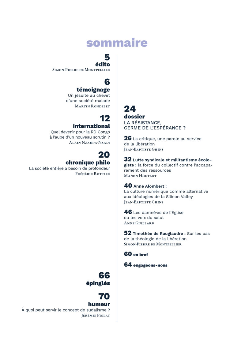 Au cœur du dossier, trois articles mettent en lumière différentes formes de domination (capitaliste, technologique et patriarcale) et tracent des pistes pour y résister. Manon Houtart croise les regards de deux jeunes activistes, l’un syndicaliste, l’autre militant écologiste, pour identifier les intersections et points de tension entre les luttes sociales et écologiques. La philosophe Anne Alombert décèle les idéologies derrière les technologies numériques et plaide pour leur démocratisation. La théologienne Anne Guillard, quant à elle, envisage les transformations nécessaires pour que l’Église catholique puisse être digne de confiance, conséquente et hospitalière.