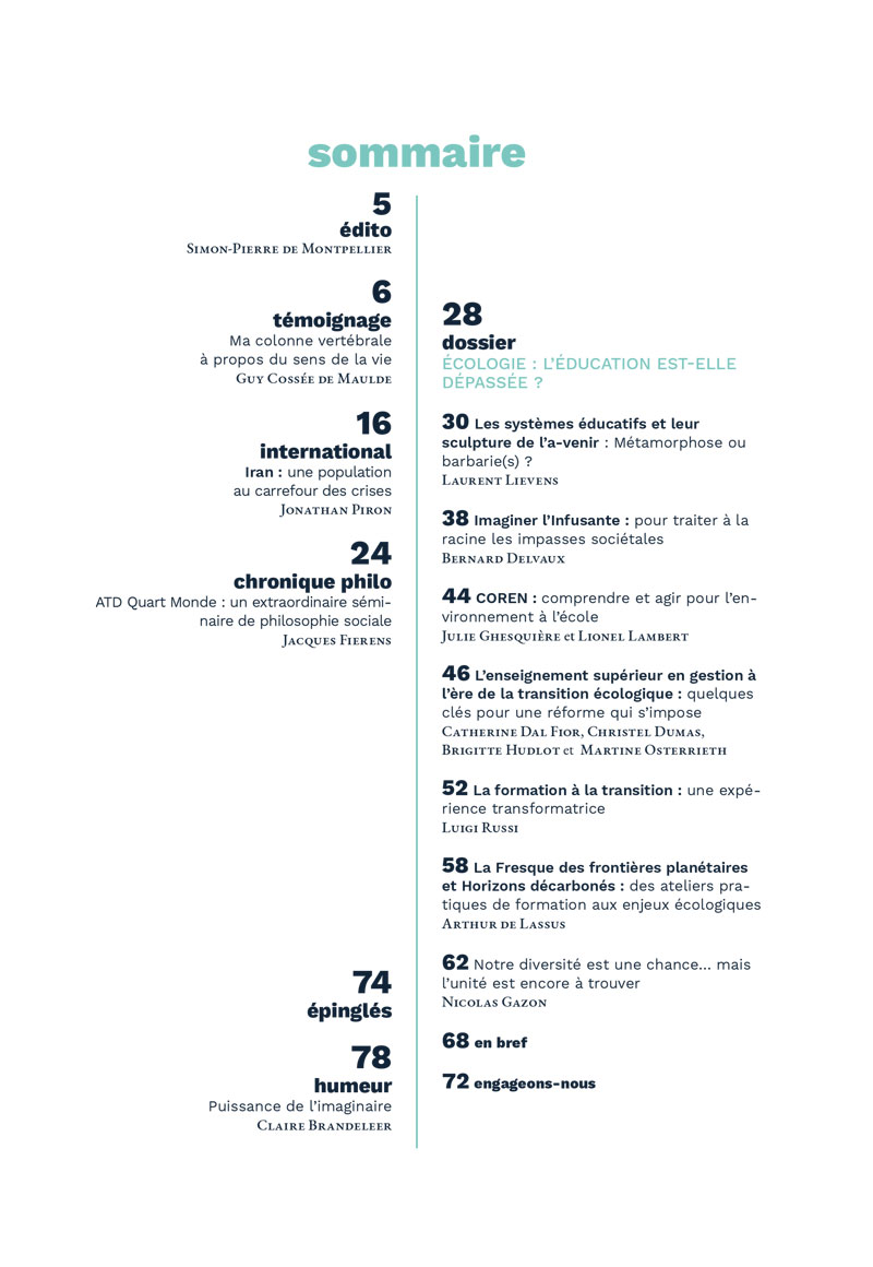 En ouverture, Laurent Lievens pose le cadre : par nos manières d’habiter le monde, notre planète devient peu à peu inhabitable pour les humains. Dans ce contexte, une métamorphose est urgente, et celle-ci engage l’ensemble des systèmes éducatifs. Ensuite, la contribution de Bernard Delvaux nous plonge dans une réflexion sur l’imaginaire social, c’est-à-dire le socle sur lequel reposent les institutions de la société, notamment éducatives. Brièvement, Julie Ghesquière et Lionel Lambert présentent l’expérience de l’association COREN dans l’accompagnement des écoles vers une transition écologique. Suit un article de Catherine Dal Fior, Christel Dumas, Brigitte Hudlot et Martine Osterrieth. Elles nous font part des démarches déployées au sein de l’ICHEC pour que leur école de gestion devienne un moteur de transformation de la société en faveur de la transition. Luigi Russi nous offre, quant à lui, ses réflexions sur la pédagogie mise en œuvre au Campus de la Transition. Enfin, Arthur de Lassus et Nicolas Gazon, deux acteurs de terrain, nous proposent des outils concrets, qui aident à gagner en lucidité et à nous situer comme acteurs et actrices de changement