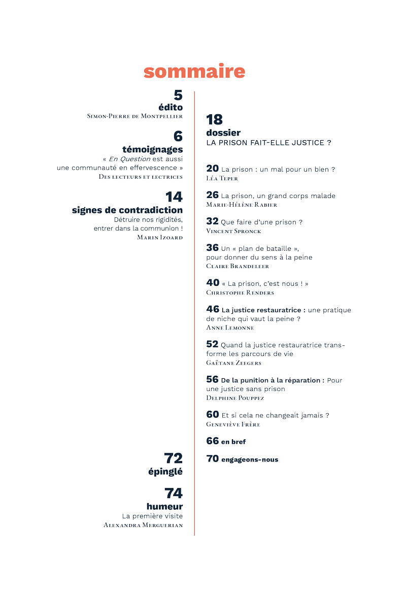 La prison est-elle un mal pour un bien ? Pour entamer ce dossier, Léa Teper questionne le système carcéral et met en lumière sa saturation, non sans une note d’espoir. En complément, Marie-Hélène Rabier porte un regard citoyen attentif sur les personnes détenues et tire la sonnette d’alarme sur leurs conditions de détention. Suivent plusieurs témoins de première ligne – aux horizons fort différents puisque le premier est directeur de prison (Vincent Spronck), le deuxième est ancien détenu (Julien), et les autres sont conseillers moraux et religieux en prison (Manar Moussa Agha, Despina Psymarnou et Hassan Khayati) – qui nous livrent leurs expériences contrastées de la prison, en quête de sens dans une réalité de non-sens. Ensuite, Anne Lemonne et Gaëtane Zeegers nous parlent de justice restauratrice, la première en décrivant le développement de cette approche alternative en Belgique et la seconde en partageant l’expérience concrète de l’ASBL Médiante. Enfin, pour approfondir, élargir et ouvrir la réflexion, Delphine Pouppez puis Geneviève Frère nous invitent à changer de paradigme, pour penser un monde sans prison et construire une société plus juste, inclusive et égalitaire.
