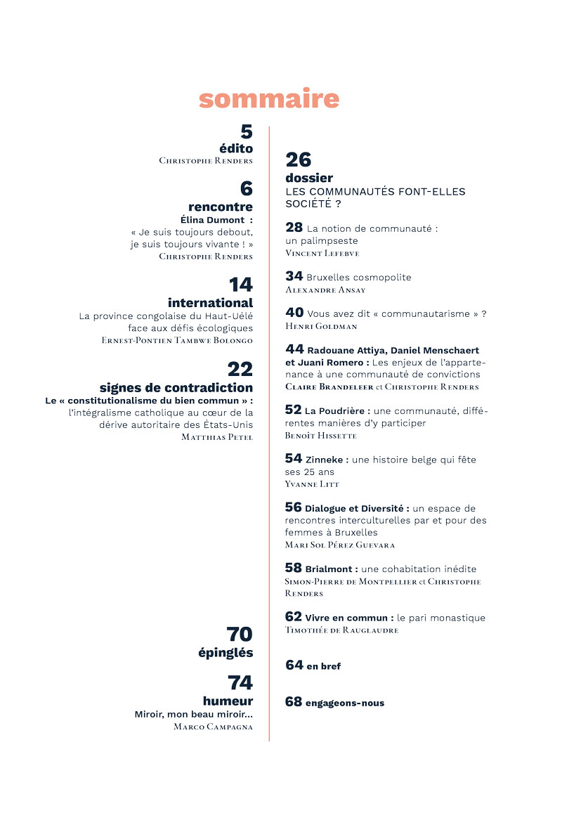 Qu’est-ce que le terme de « communauté » recouvre aujourd’hui ? Pour ouvrir ce dossier, Vincent Lefebve explore les multiples dimensions de cette notion aux usages politiques, sociaux et philosophiques mouvants. Ensuite, Alexandre Ansay analyse le cas de Bruxelles, la deuxième capitale la plus cosmopolite du monde : forme-t-elle une communauté de communautés ? Dans un papier incisif, Henri Goldman démonte les usages flous et idéologiques du terme de « communautarisme », si souvent brandi comme une menace. Comment les communautés convictionnelles peuvent-elles contribuer au vivre-ensemble ? Nous croisons les regards de Juani Romero, catholique, Radouane Attiya, musulman, et Daniel Menschaert, franc-maçon.