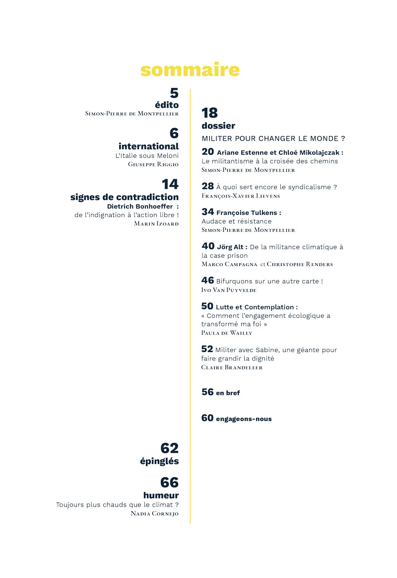 Comment s’engager aujourd’hui, à l’heure où bouleversements écologiques, injustices sociales et crises démocratiques s’entrecroisent ? Ce dossier explore les multiples visages du militantisme contemporain. Ariane Estenne et Chloé Mikolajczak ouvrent la réflexion en croisant leurs analyses expérimentées des luttes sociales et écologiques. Puis, François-Xavier Lievens éclaire le rôle du syndicalisme dans le paysage socio-politique belge. Françoise Tulkens sonde ensuite la vitalité de notre démocratie, de l’État de droit et des droits humains, et esquisse des pistes pour les revivifier.