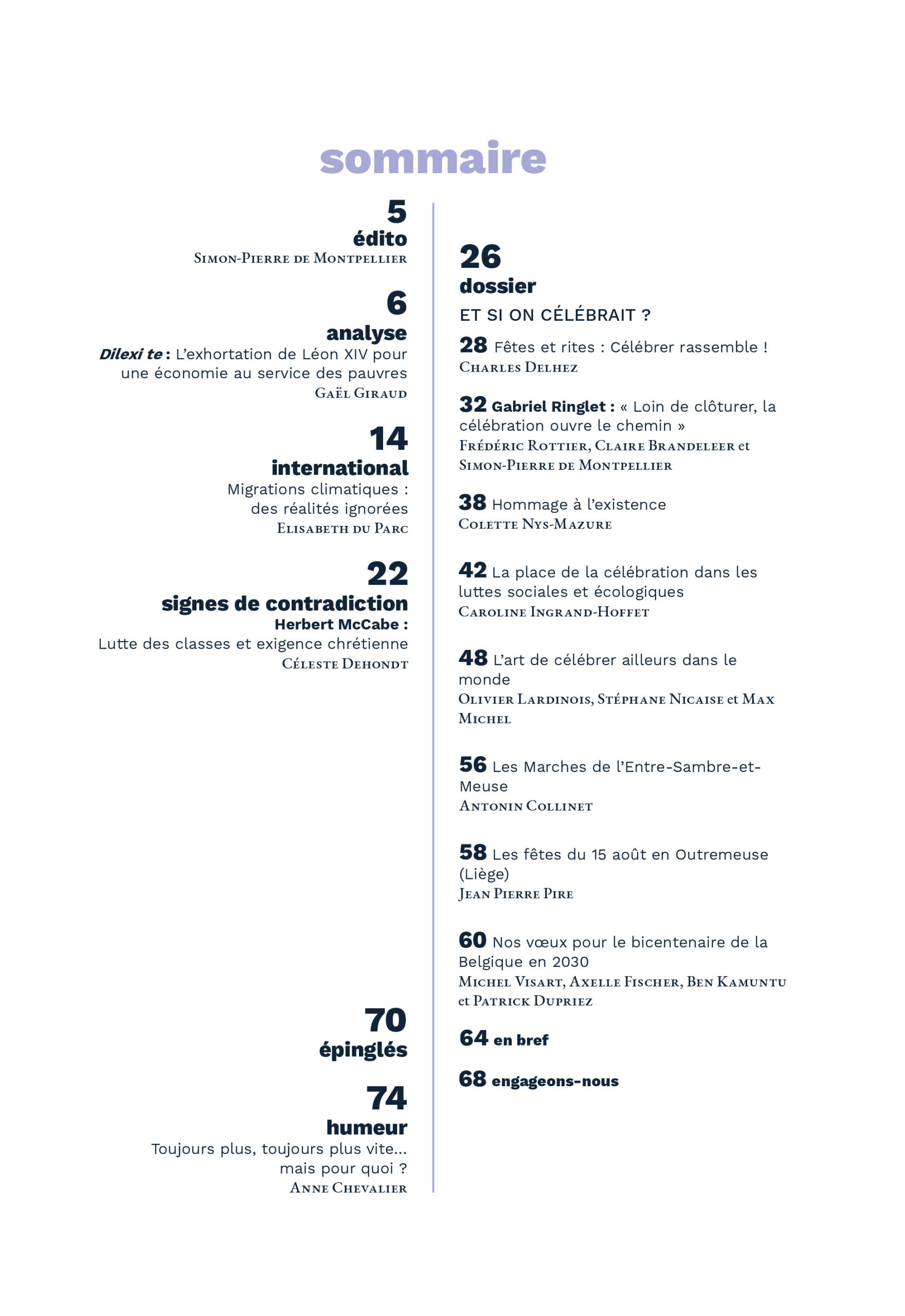 Partout, des célébrations rassemblent et inspirent l’engagement. À Taïwan, une danse aborigène accueille l’étranger, rapporte Olivier Lardinois. À l’île de La Réunion, une course solidaire transcende les différences, relate Stéphane Nicaise. En République dominicaine, des messes de quartier transforment la rue en espace de rencontre, observe Max Michel. En Wallonie, folklore et fêtes populaires nourrissent aussi la joie et le vivre-ensemble, comme le montrent Antonin Collinet à propos Marches de l’Entre-Sambre-et-Meuse et Jean Pierre Pire au sujet des fêtes du 15 août en Outremeuse (Liège). Enfin, ouvrant de nouvelles perspectives, Michel Visart, Axelle Fischer, Ben Kamuntu et Patrick Dupriez esquissent des pistes pour imaginer une Belgique qui unisse dans la diversité, à l’aube de son bicentenaire en 2030.