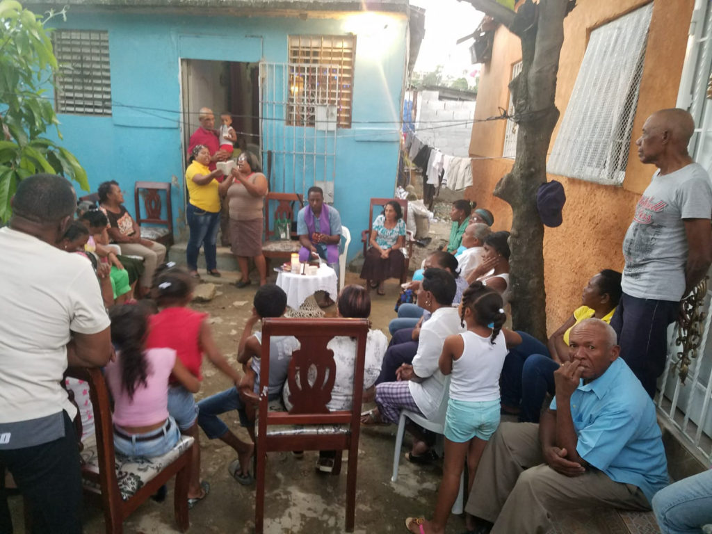 Vue de l’extérieur, cette rencontre pourrait paraître assez dérisoire ; pourtant, elle recèle bien des trésors. Il y a d’abord le temps de la préparation et de la concertation, car il s’agit de ne rien laisser au hasard, en choisissant avant tout le lieu de la célébration. Il faut ensuite partager les responsabilités, en commençant par celle de garantir le nettoyage et la mise en condition de l’espace choisi : prêt d’une table qui servira d’autel et d’une nappe pour la couvrir, avec une bougie, un bouquet de fleurs, auquel s’ajoute quelquefois un cadre au motif religieux – image du Sacré Cœur, de la Vierge Marie contemplant l’enfant Jésus nouveau-né, invoquée ici sous le vocable de la Virgen de la Altagracia, etc. Le jour J, on aura apporté quantité de chaises de tous genres, ou de préférence des bancs, car ceux-ci permettent de gagner de l’espace. Il faut aussi, longtemps à l’avance, communiquer à la communauté paroissiale le lieu de la célébration communautaire et réserver en conséquence un petit système d’amplification portable dont dispose la paroisse. Plus important, il aura fallu veiller au contenu de la célébration et, pour ce faire, définir, là aussi en concertation avec la paroisse, le thème au cœur de la réflexion du jour, ainsi que les lectures bibliques qui l’accompagneront. De là aussi dépendent directement les deux ou trois questions qui animeront dialogue et réflexion communautaire.